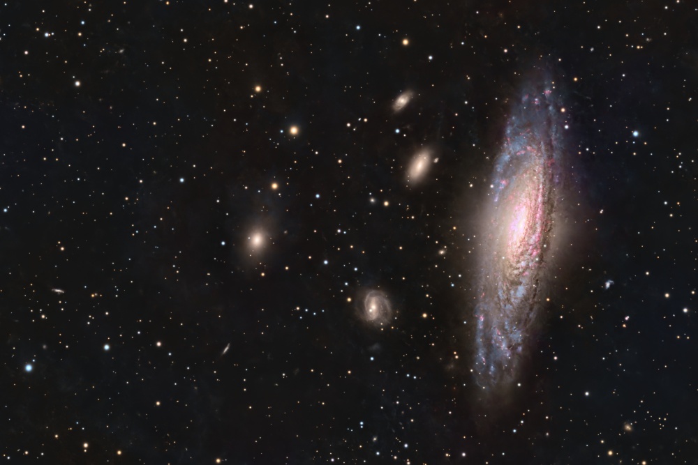 NGC 7331 is the largest galaxy in this image. It is located in Pegasus, and is about 40 million light years away, and has a diameter of about 120,000 light years. It is the biggest member of the “Deer Lick Group,” several other members of which are strewn around (mostly to the right of) NGC 7331. These galaxies are about 10 times further away, or 500 million light years (yes, half a billion light years!). See the annotated image which identifies most of the galaxies. I have imaged this galaxy in a wider field of view; you can find it here.