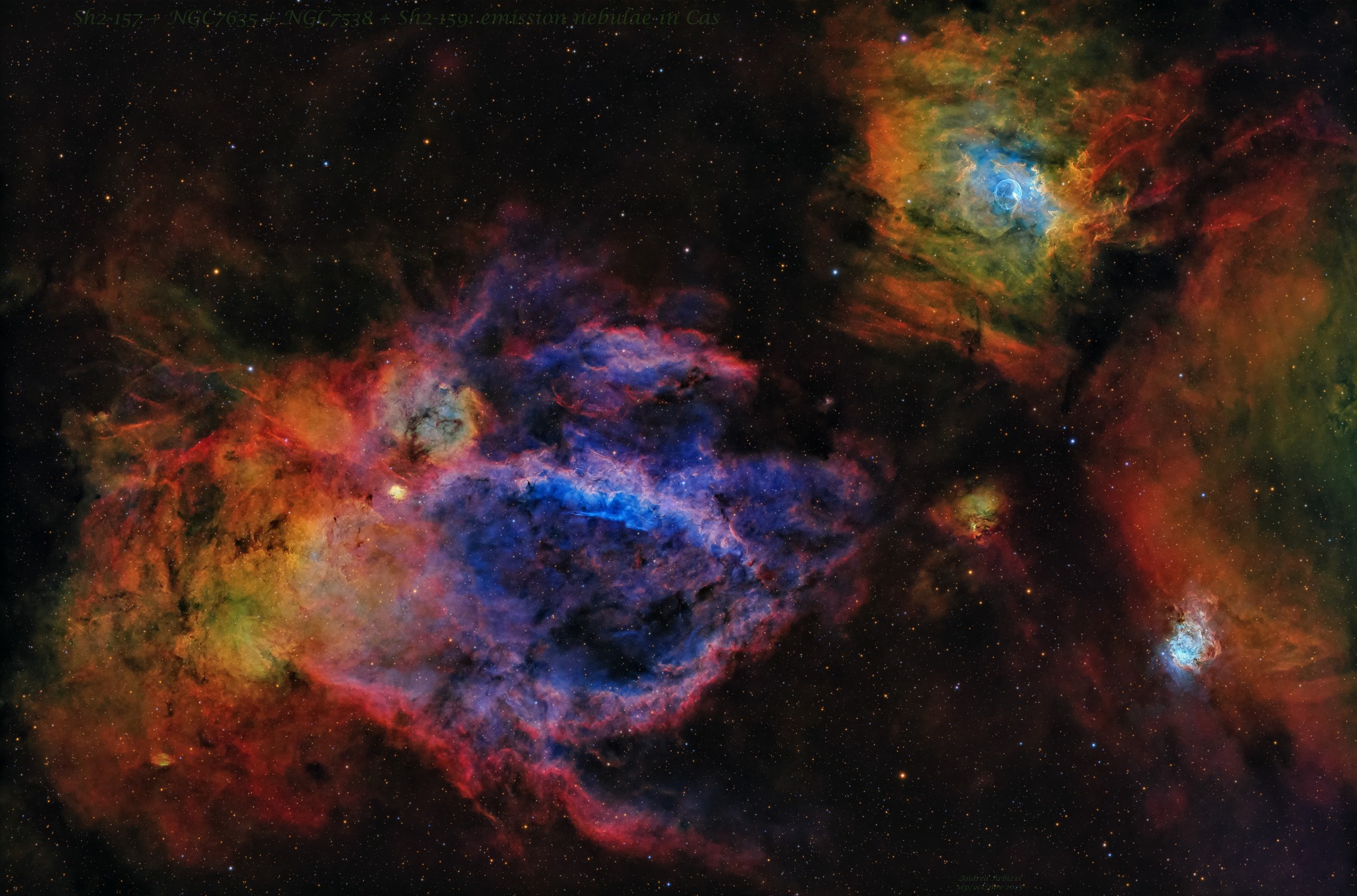 In this image, you can admire four emission nebulae: the largest one in the centre-left is Sh2-157, commonly known as the “Lobster Claw”; in the upper right-hand corner is the famous “Bubble”; in the centre is the small nebula Sh2-159, while the nebula NGC7538, known as the “Northern Lagoon”, can be seen on the lower right-hand side.