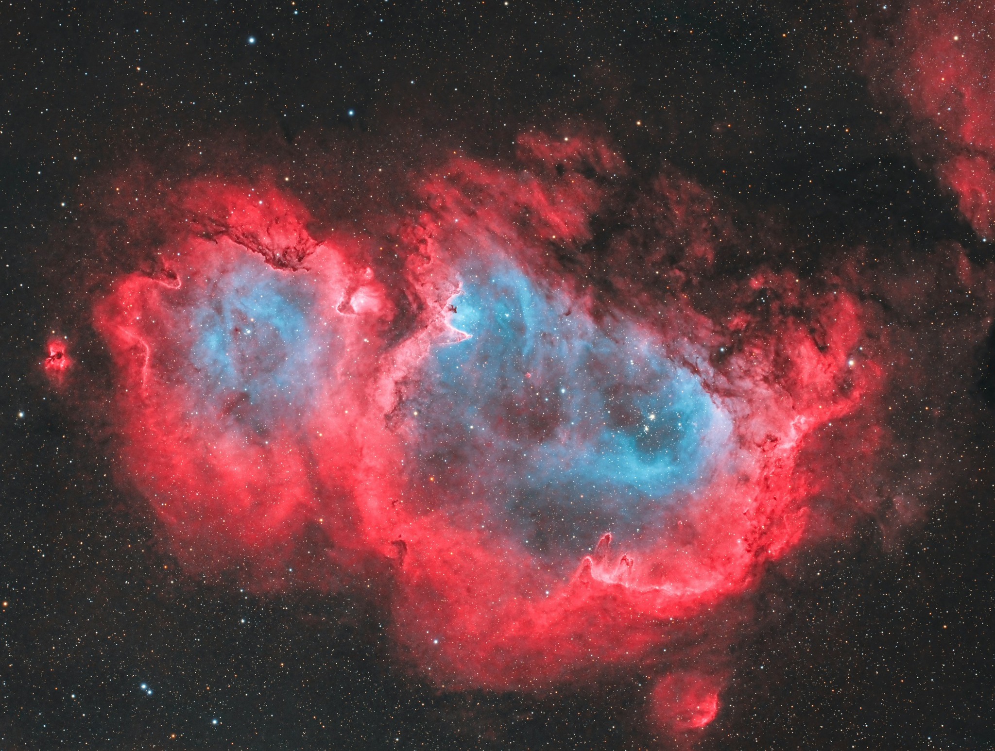 The Anima Nebula is a vast emission nebula located approximately 6,000-7,500 light years from Earth. It is located in the constellation Cassiopeia and is famous for forming a pair with the nearby Heart Nebula (IC 1805).