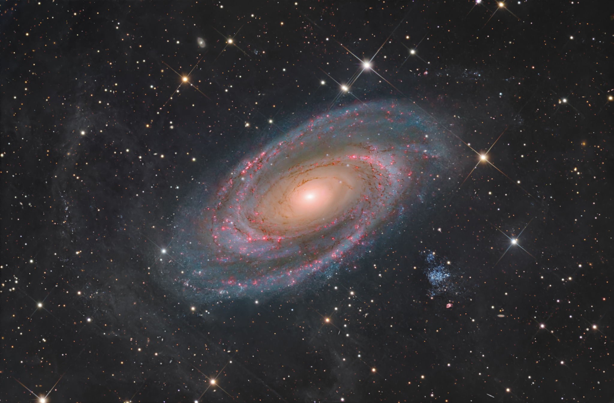 M81 (NGC 3031), also known as Bode’s Galaxy, is a nearby spiral galaxy located approximately 12 million light-years away in the constellation Ursa Major. This galaxy and its neighbour M82 are therefore among the galaxies closest to our own.
