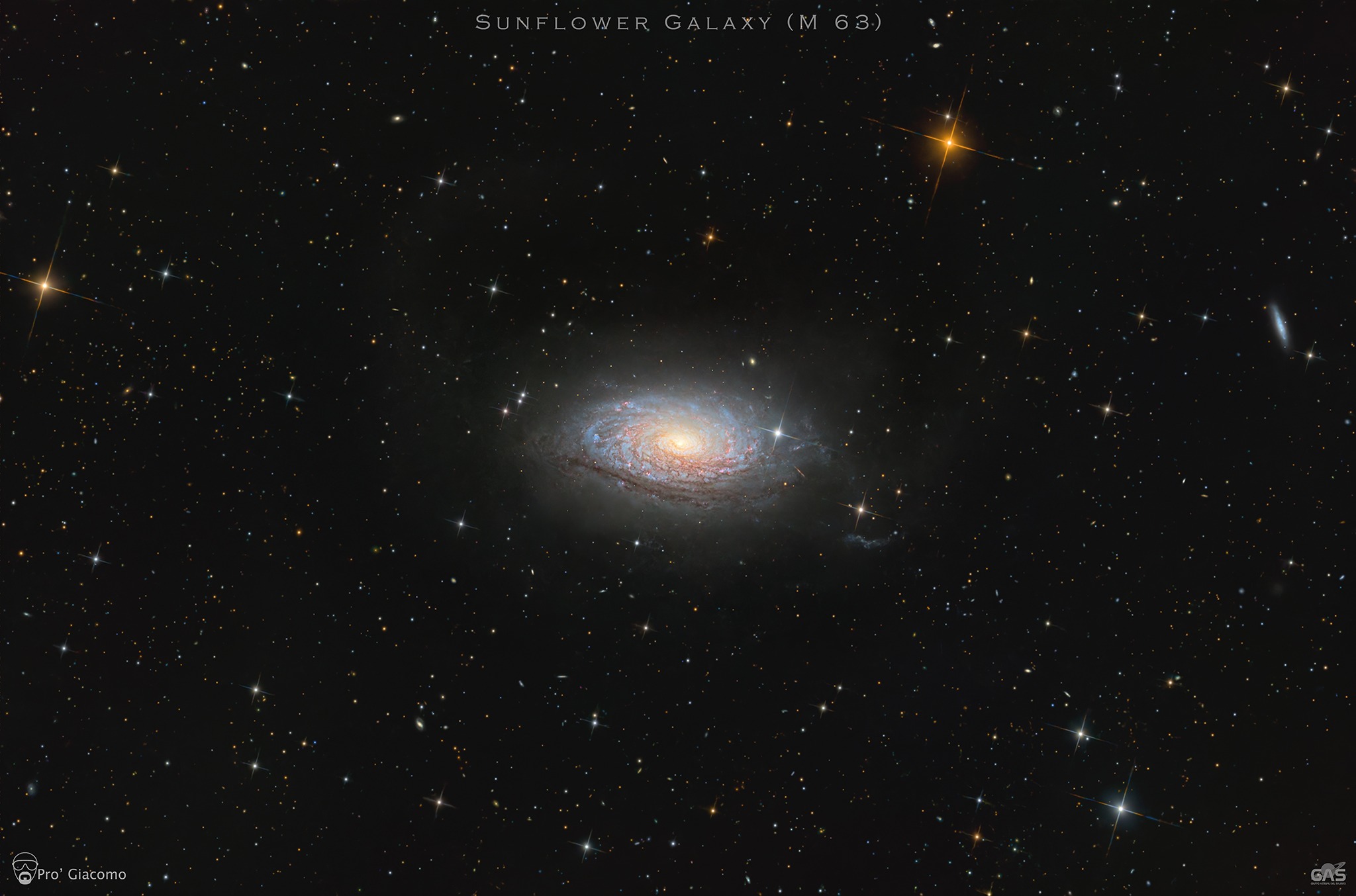 The Sunflower Galaxy is an Sb or Sc-type spiral, displaying an irregular spiral pattern; it appears to form a physical group with the Pinwheel Galaxy, the Whirlpool Galaxy and many other minor galaxies; it may belong to the M101 Group (a subgroup of M51). The name ‘Sunflower’ is due to the vast number of spiral arms surrounding the nucleus, tightly wound around it and permeated by a large number of interstellar dust clouds; the total mass of the galaxy is estimated to be between 80 and 140 billion solar masses, with a diameter of 90,000 light-years, similar to that of our Milky Way. Its distance is estimated at 37 million light-years, and it is receding from us at a speed of 580 km/s.
