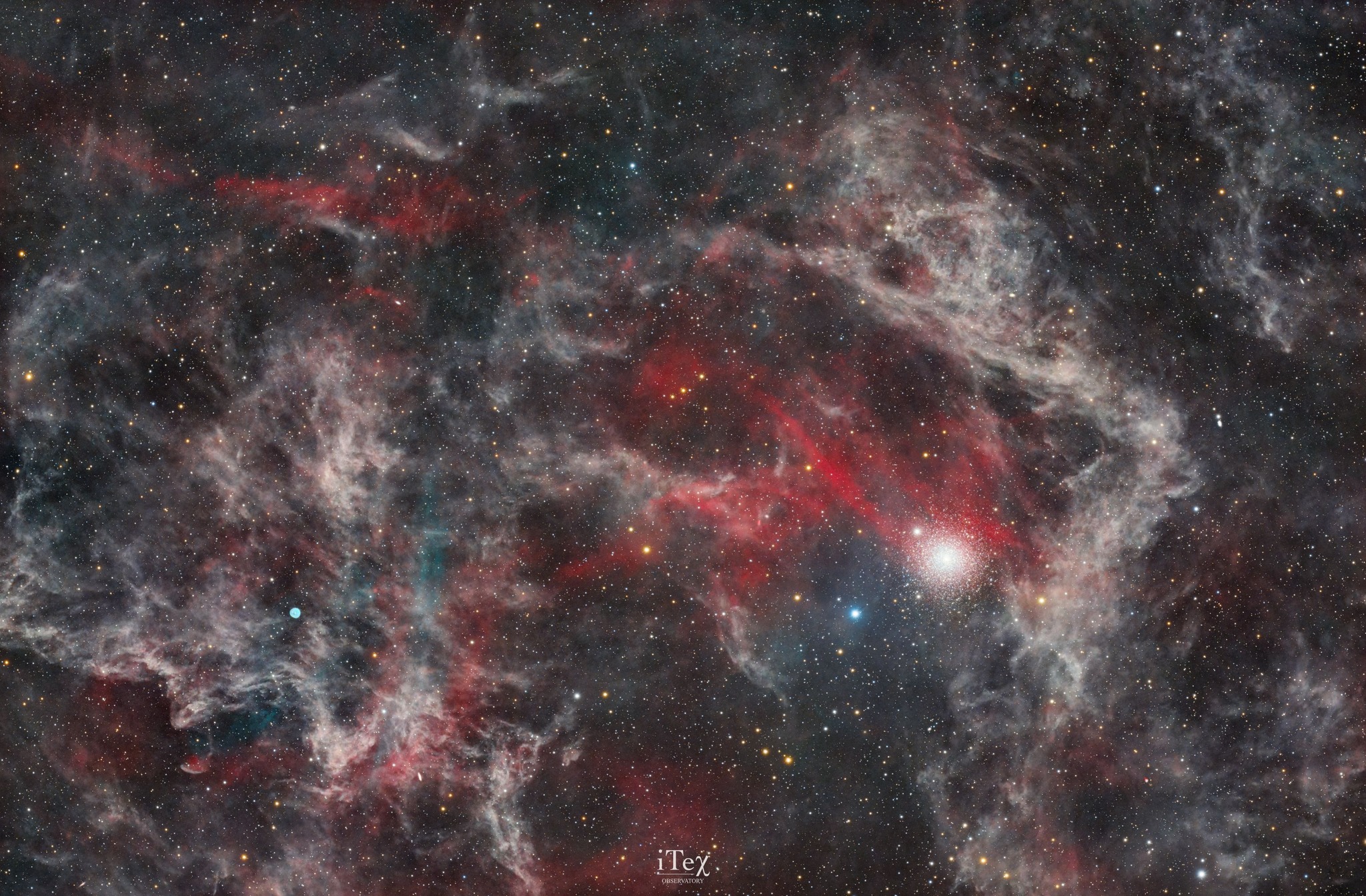 Together with the team at Itex, we decided to re-image this wide-field view in HaO3LRGB mode: this was to break away from the usual way of viewing this cluster and, after many hours of exposure, reveal the faint hydrogen signal hidden throughout the field; and, more challenging still, we spent many hours in the Oxygen III band, because after careful online analysis, we became certain of the presence of this faint signal in certain areas around the cluster itself