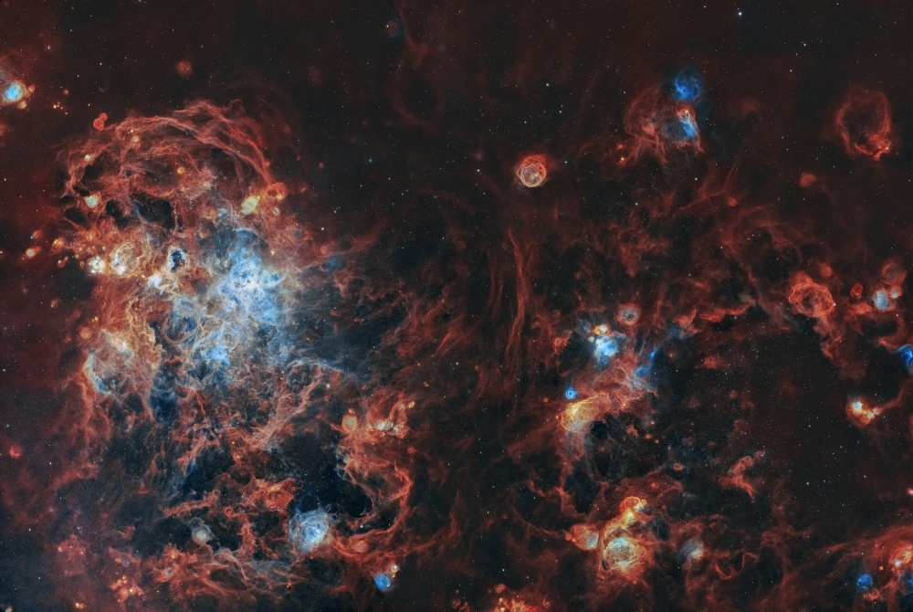 "This image captures a treasure trove of interesting structures within the Tarantula Nebula in a narrowband palette. There is a nice range of hues, as well as a good balance between sharpness and smoothness; brightness and contrast."