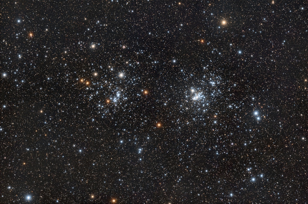 NGC 869 (right) and NGC 884 each contain hundreds of stars and are about 13 million years old (compared to 75-150 million years for the Pleiades). Lying about 7,500 light years away and a few hundred light years apart, they have a combined mass about 6,500 times our Sun’s. However, their combined halo is more than 20,000 solar masses. The clusters are moving towards us at a speed of about 40 km/s. These open clusters are bright enough that they were originally given star designations (h- and Chi Perseus). They are visible to the naked eye, appearing as an oval foggy patch in a dark sky. They look like sparkling white diamond dust in binoculars or a small telescope. Images reveal subtle differences in the hues of the stars.