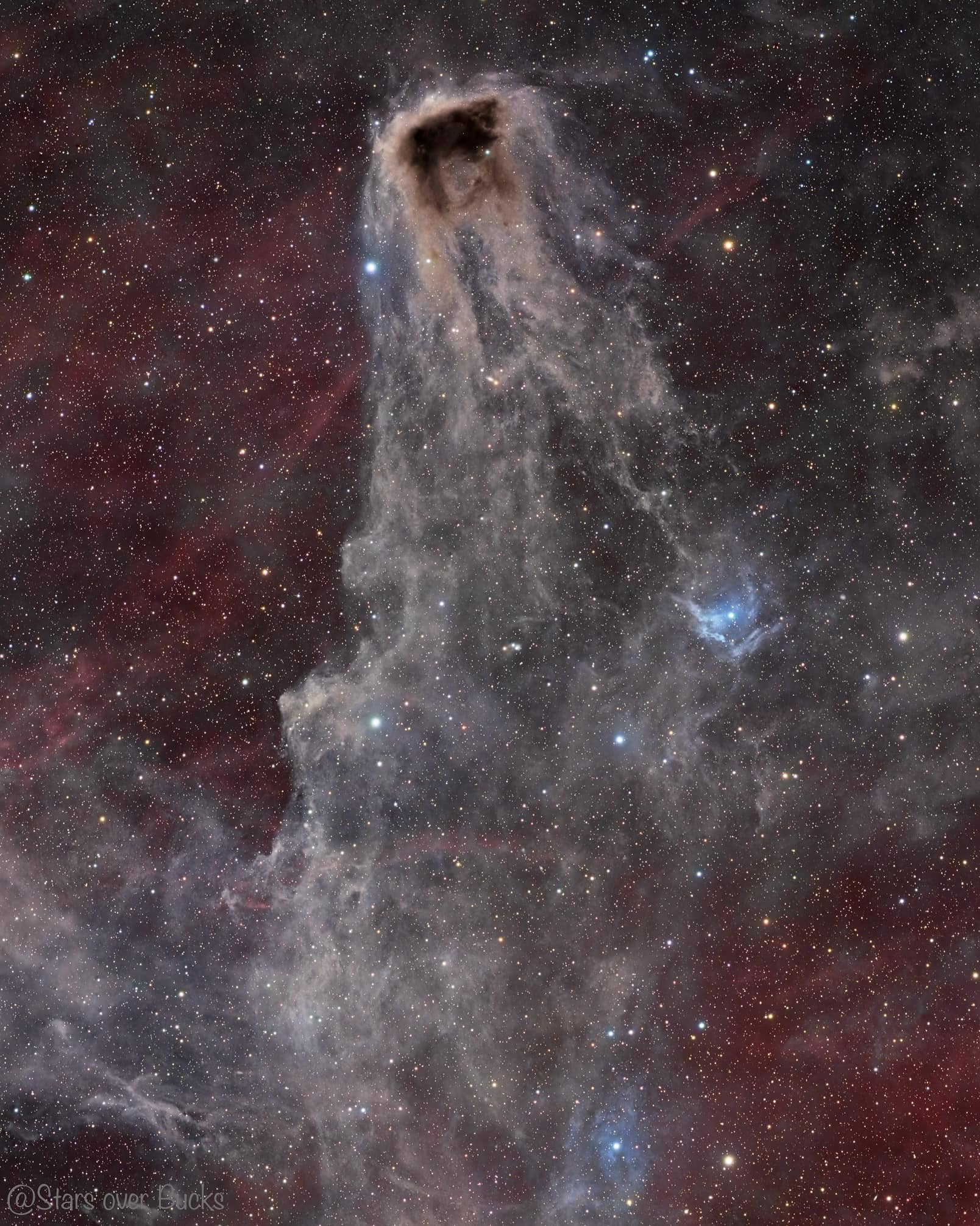 The Toast Nebula (LDN1221) part of a large molecular cloud in the constellation Cepheus. It’s hard not to see a slice of toast that maybe was left in the toaster too long. It contains dark nebula, blue reflection nebula and red emission nebula. There is a high level of star formation in this area particularly within the toast! The surrounding area is covered with dark and reflection nebula which include the Shark and Wolf’s Den nebula that I have posted recently. This image required over 20 hours of exposure time captured over 4 nights.