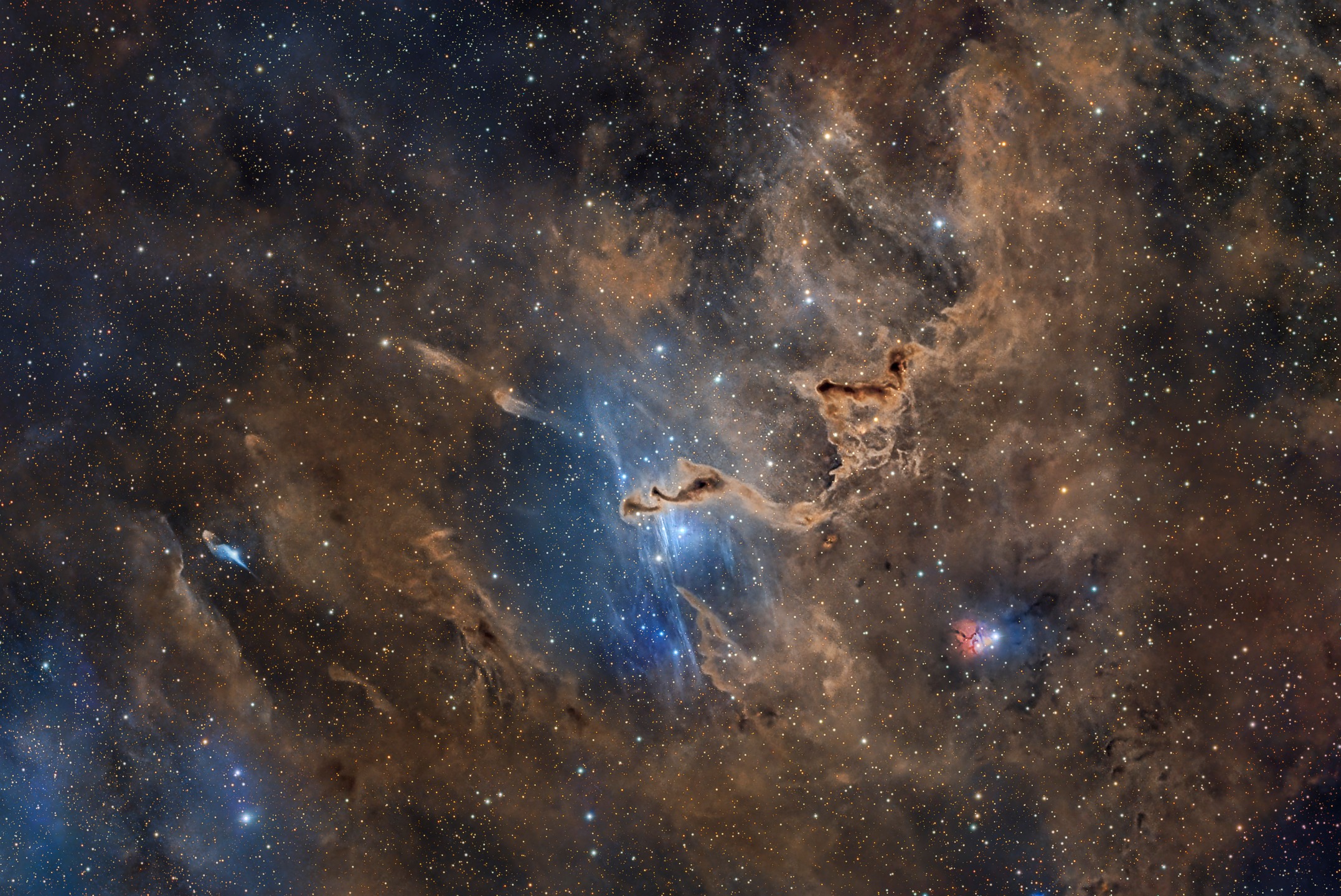 Located in the constellation Cassiopeia, LDN 1355, together with the surrounding dark nebulae LDN 1357 and 1358, formed an interesting image of an “outstretched hand”. Just below the ‘palm’ of the outstretched hand is the blue reflecting nebula VdB 9, illuminated by the star SU Cas. On the right edge of the image is another reflecting nebula, VdB 7, with hints of red and blue, surrounding the variable star RZ Cas.