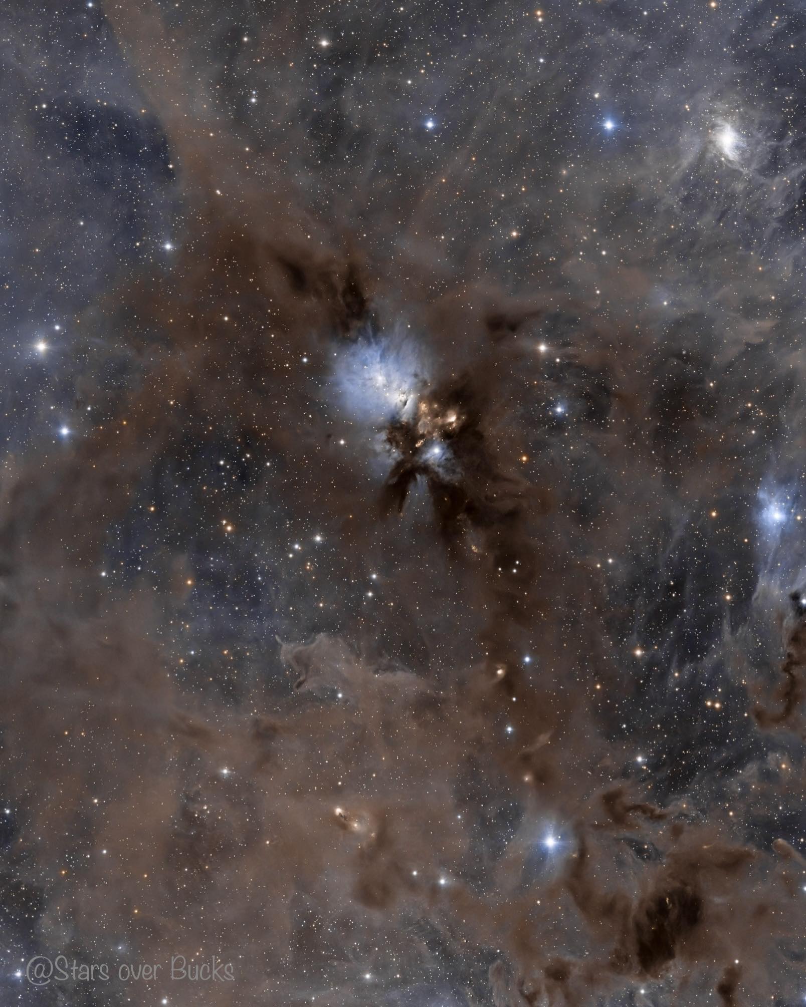 Located about 1,000 light-years away in the Perseus molecular cloud, NGC 1333 spans roughly 4 light-years across and teems with newborn stars still wrapped in dense dust and gas. This reflection nebula glows blue from scattered starlight, while dark filaments and faint red jets reveal regions of ongoing star formation. It’s a turbulent stellar nursery — a glimpse into what our own Sun’s birthplace might have looked like 4.6 billion years ago. I captured this nebula in one night from a dark sky location.