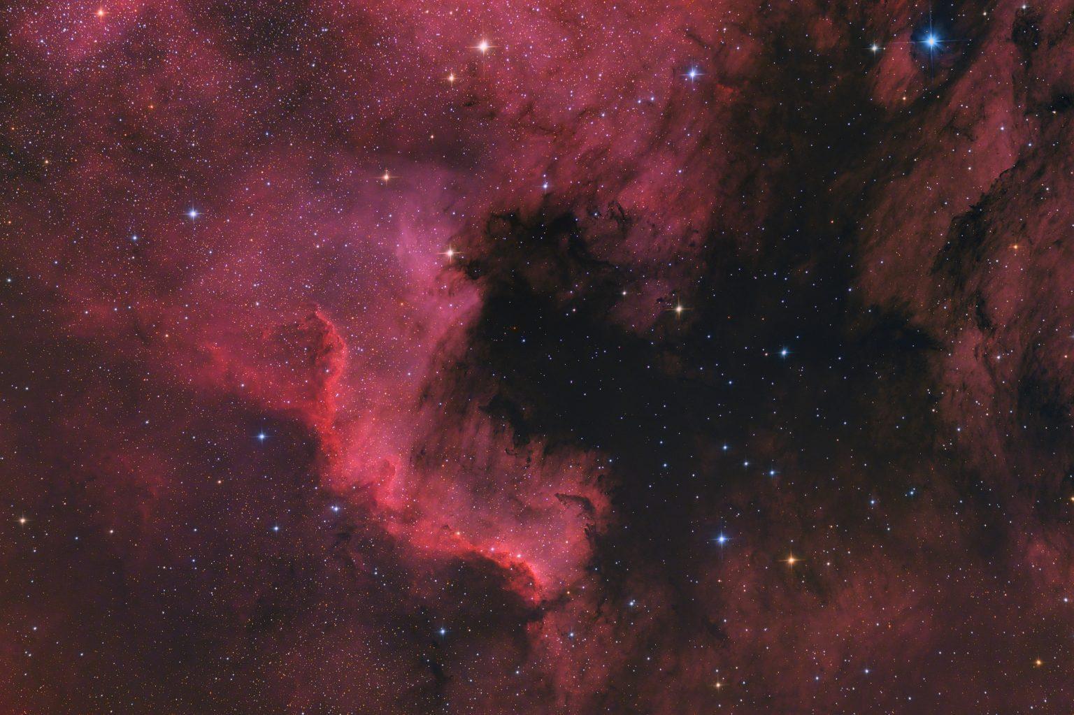 This image focuses on the Cygnus Wall. The Cygnus Wall is a portion of a much larger nebula called the "North America Nebula" located around 2600 light years from Earth. The hydrogen clouds in these nebulas are lit by stars showering ionized radiation on them.