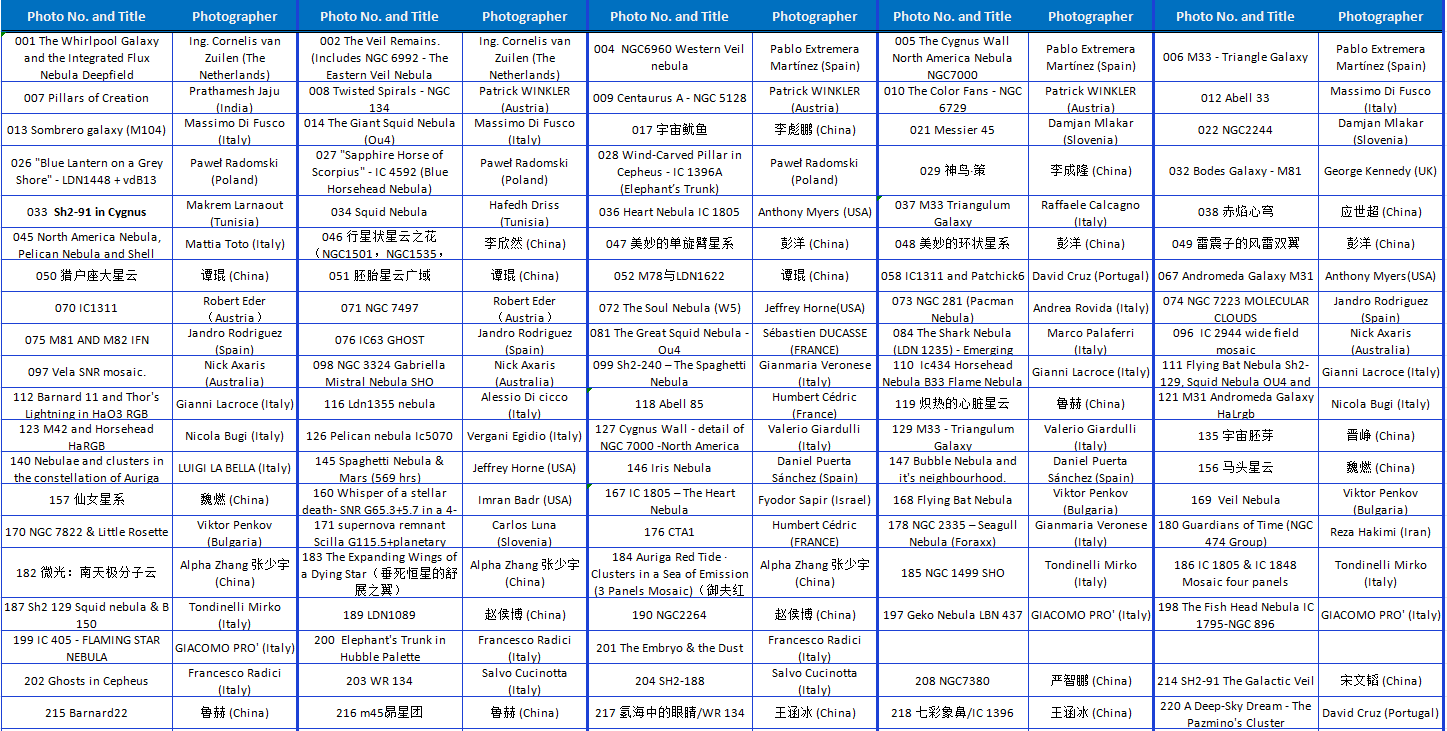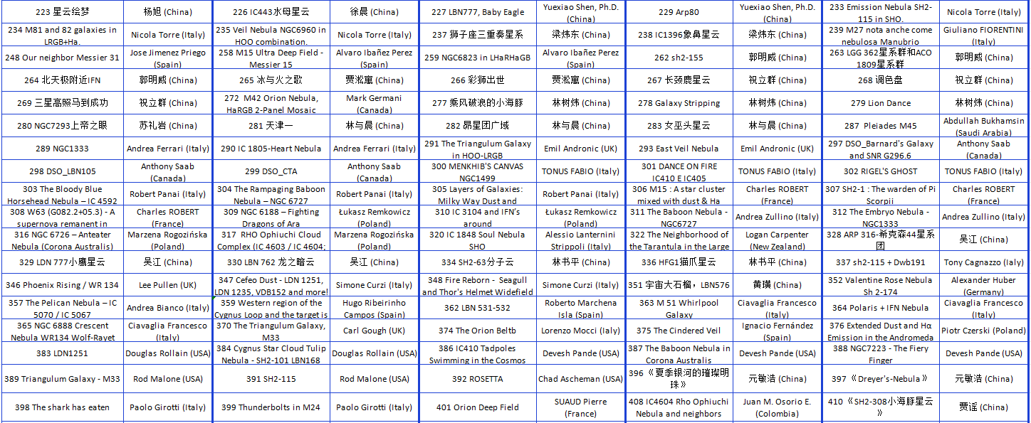 After a careful preliminary review, 250 works have been shortlisted for the next stage. This includes 188 entries from the DeepSky Group and 62 from the Solar System Group. Congratulations to all the selected entrants!